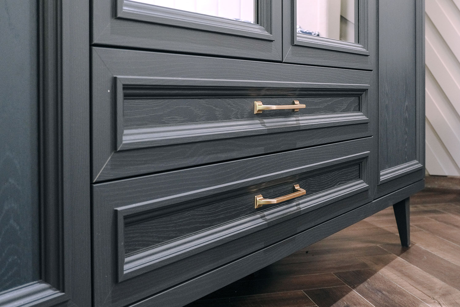 - Фасады: рамочной конструкции, в «глухих» фасадах — вставки из ЛМДФ 6 мм, в зеркальном фасаде — вставка зеркало 4 мм;