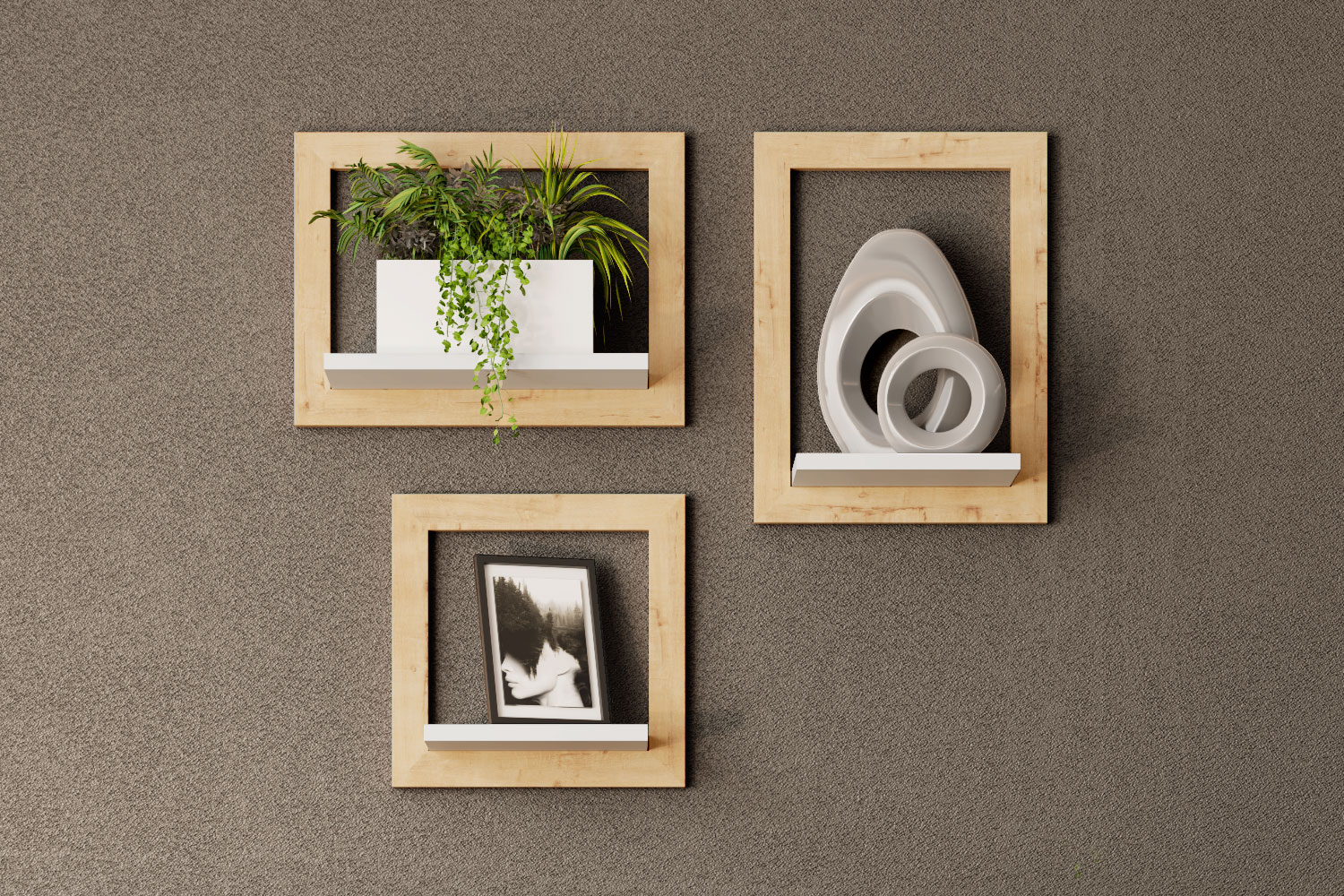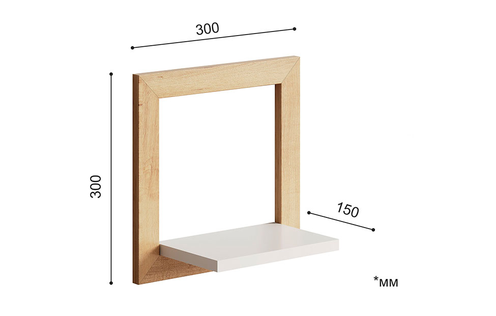 Актуальное цветовое решение — рамка белого цвета и текстурированная под «дуб бунратти» полка делает изделие подходящим для обстановки в стиле сканди или облегченный лофт. Модель фиксируется на стене-основании с помощью замаскированного менсолодержателя и навеса и выдерживает до 1-2 кг равномерно распределенного груза.