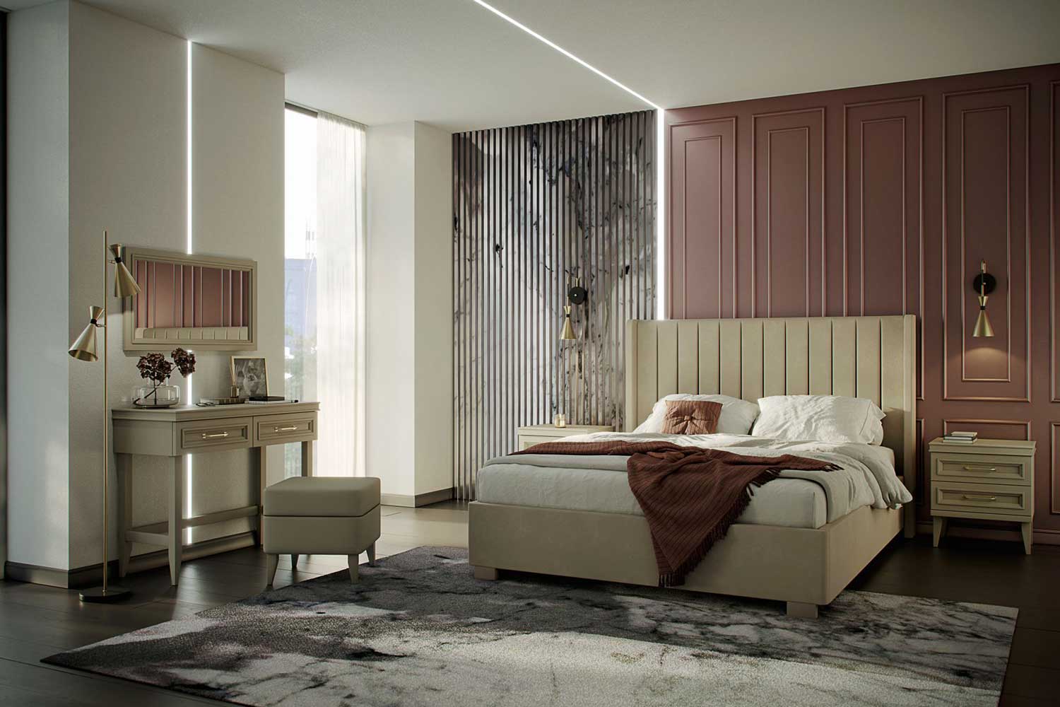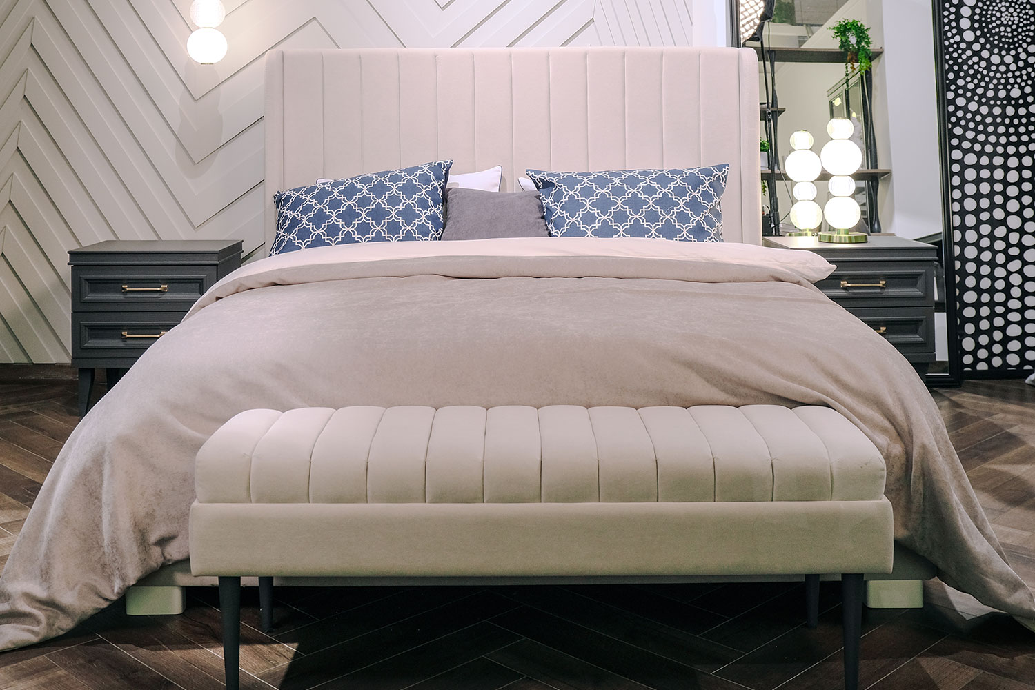 - Изголовье декорировано вертикальными линейными утяжками. Имеет эргономичную форму и размер;