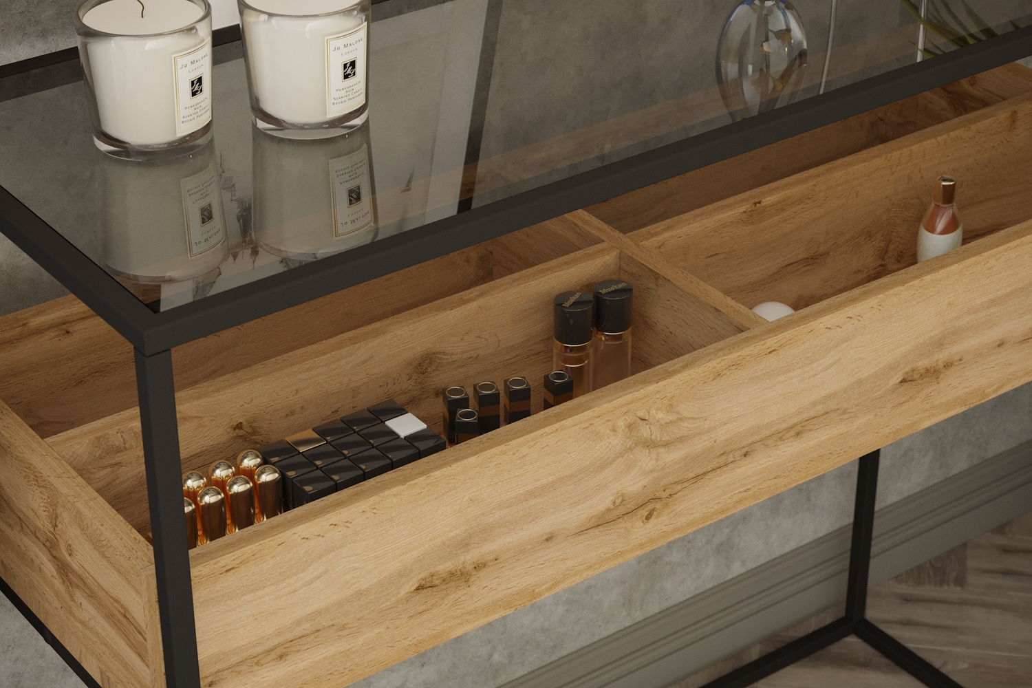 Консоль Касс выполнена в современном лаконичном стиле и уместно дополнит интерьер спальной комнаты или прихожей. Стильная консоль приковывает внимание прежде всего своим исполнением: комбинацией материалов. Стеклянная столешница из тонированного закаленного стекла в сером цвете дополнена ячейками из ЛДСП для удобного хранения подручных вещей. А прочный металлический каркас толщиной 15 мм обеспечивает высокую прочность и устойчивость.