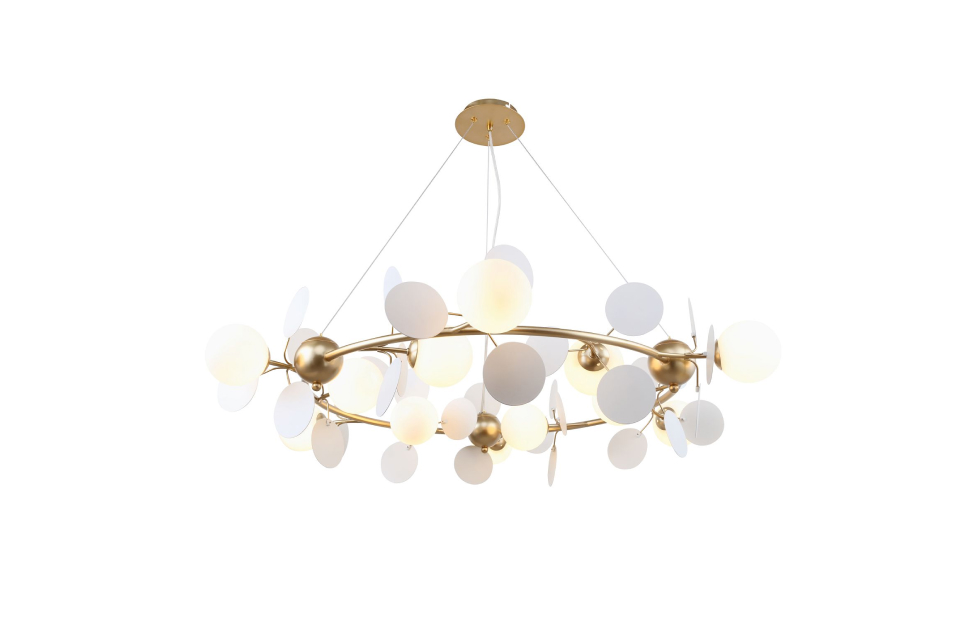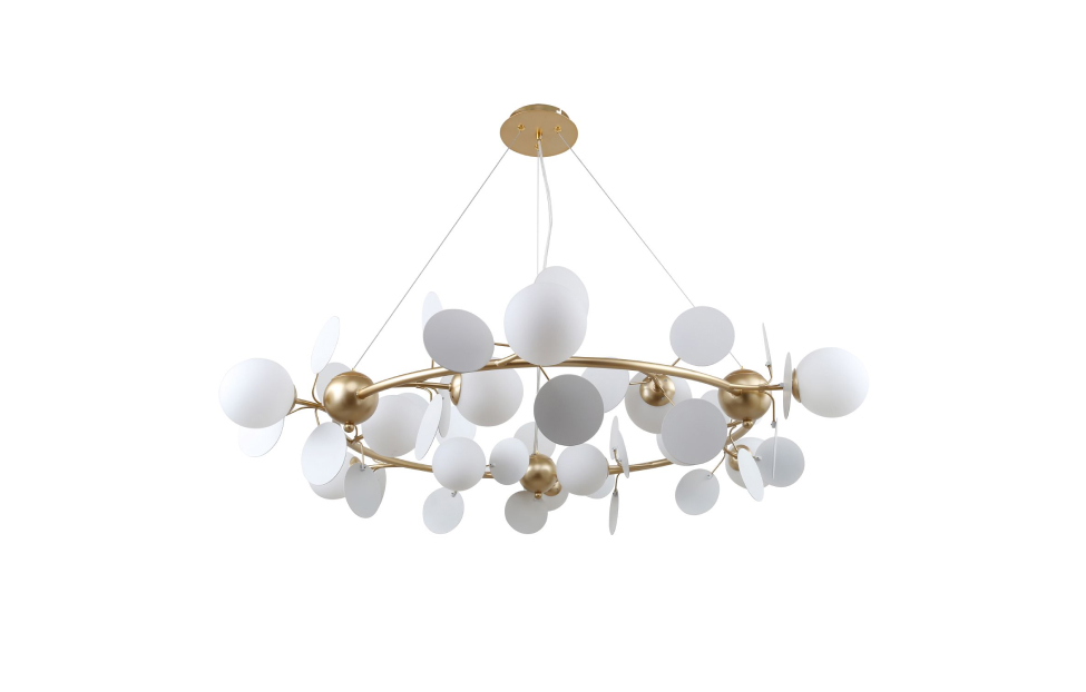 Коллекция Bliss – это гармоничное сочетание белого и золотого цветов, представляющее собой переосмысленную версию более разноцветной коллекции Multi Bliss. В основе обеих коллекций лежит одна флористическая идея, но Bliss утонченно акцентирует внимание на элегантности белого и роскоши золотого. Подойдет в интерьеры различной стилистики - от Прованса до эклектики. Металлический каркас золотого цвета, круглые стеклянные плафоны молочного цвета, декоративные круглые белые пластины, декоративные золотые шары, регулируемая высота.