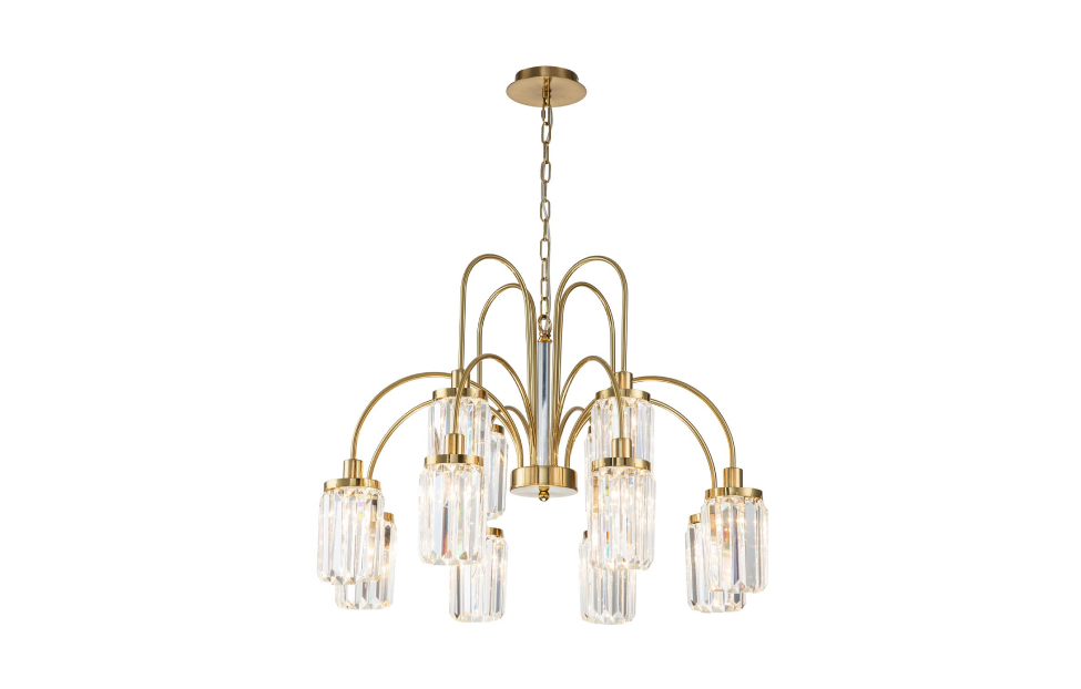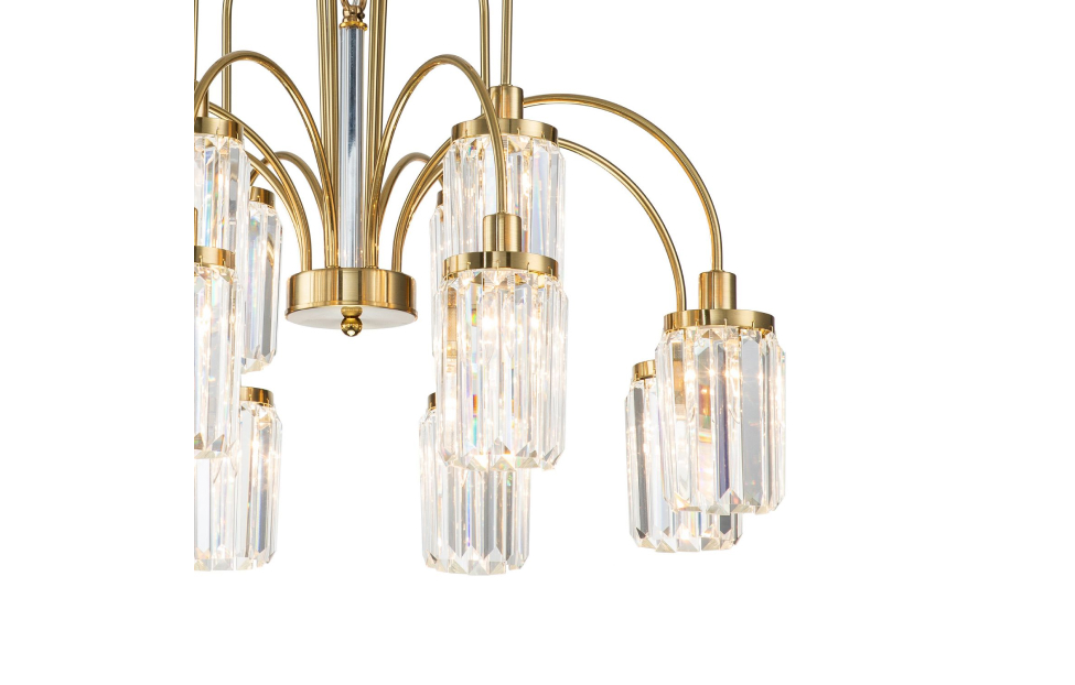 Duke – коллекция в современном стиле. Рожки изысканной формы, напоминающей струи фонтана, покрыты золотой гальваникой и декорированы хрустальными подвесками прямоугольной формы, которые красиво преломляют свет ламп. Центральный шток украшен стеклянным цилиндром.