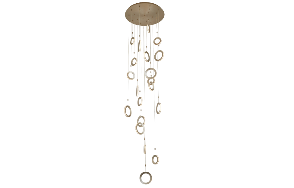 Коллекция Jongleur демонстрирует искусство баланса и динамики, где каждый элемент словно находится в постоянном движении. В качестве плафонов использованы объемные кольца цвета матовой латуни, которые светятся по периметру с помощью встроенной LED-ленты. Они закреплены под разным углом к тонкому черному каркасу светильника, будто вращаются вокруг основания, словно цирковые обручи хула-хуп. Регулируемая высота.