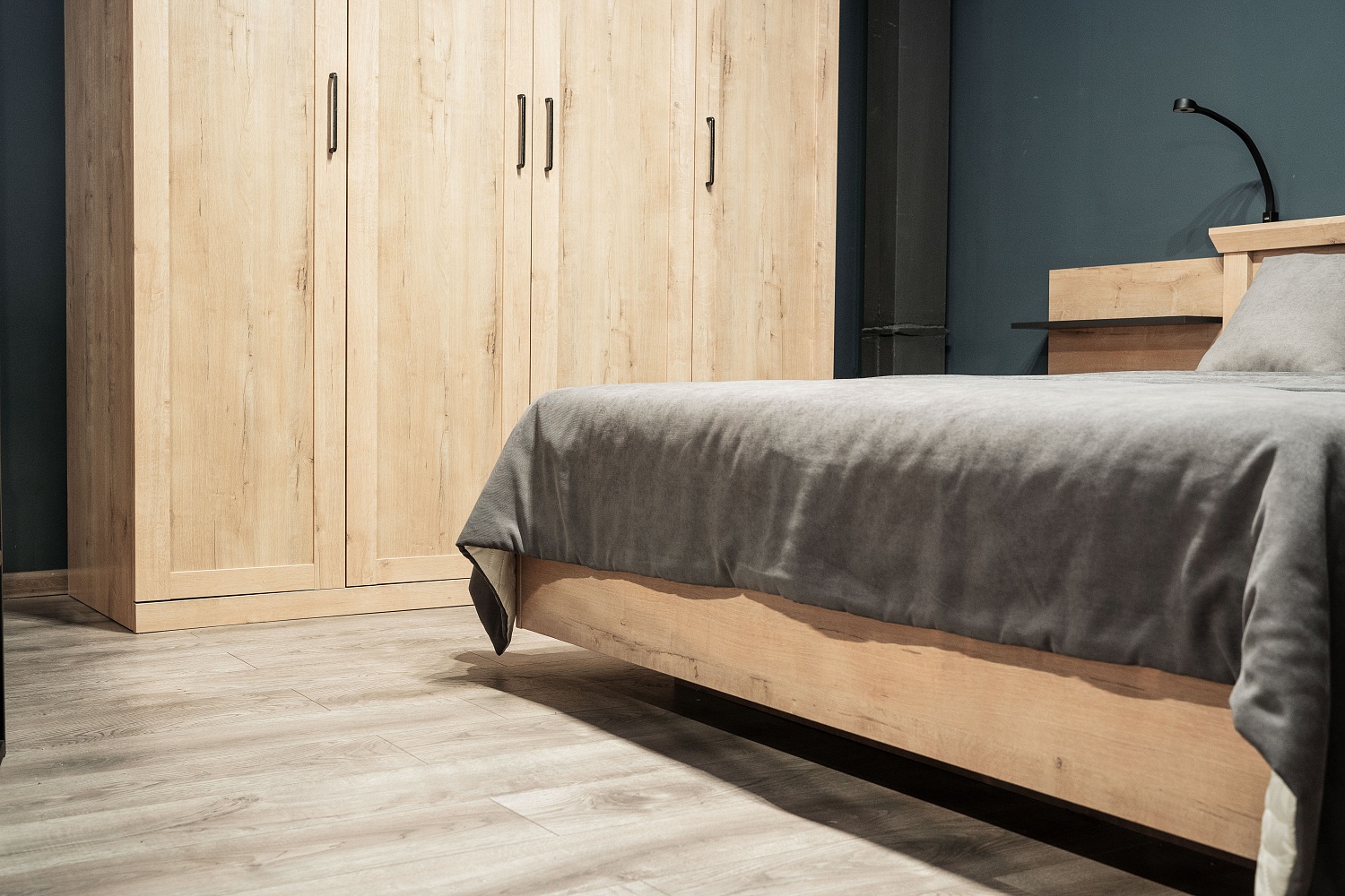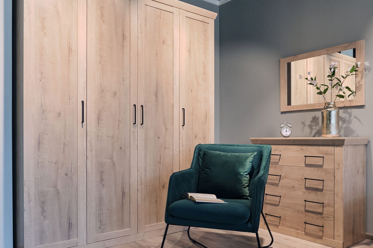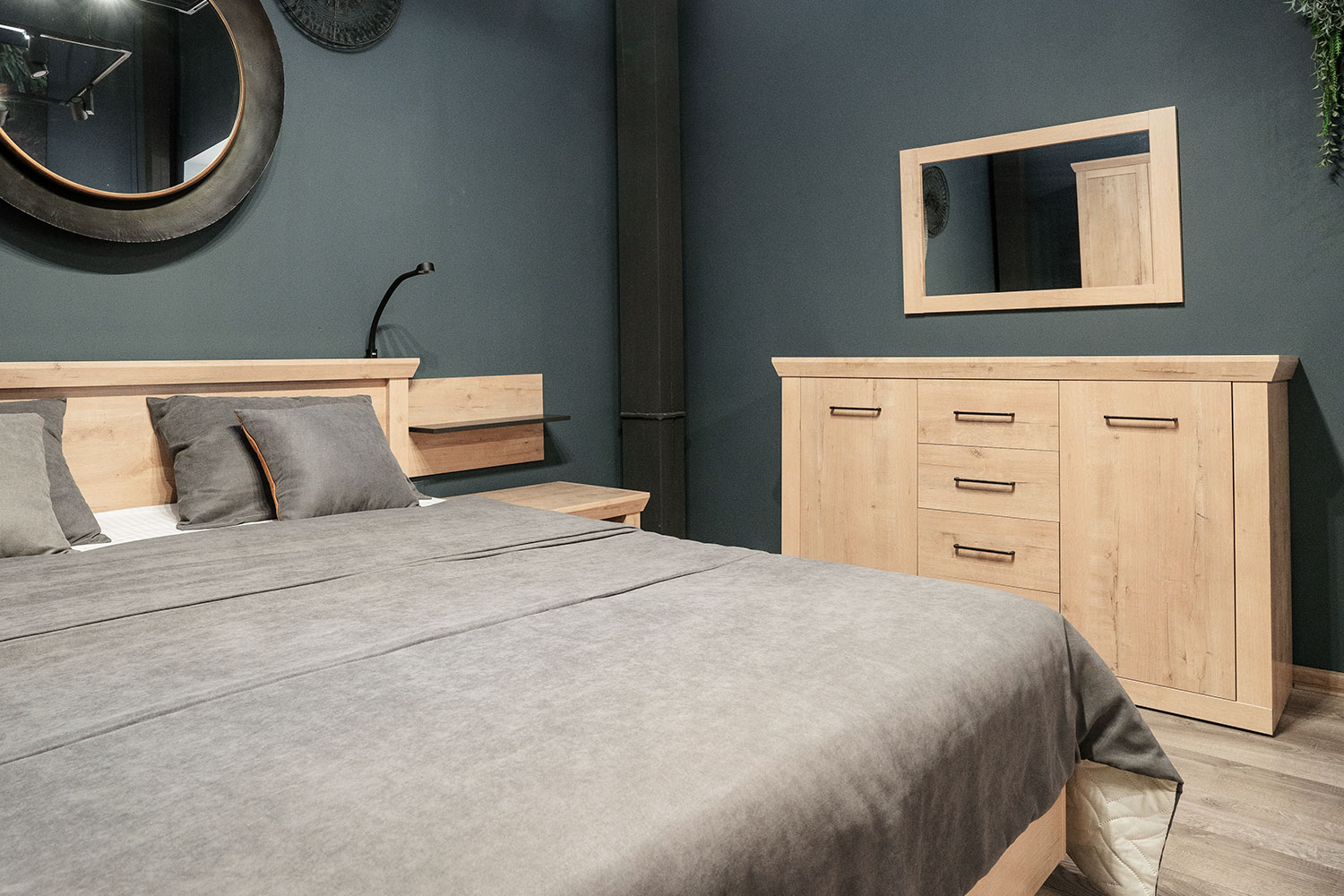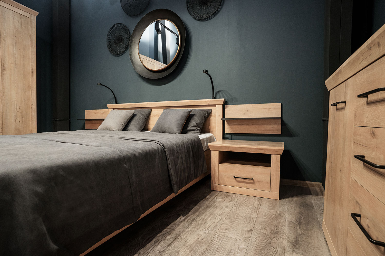 Сдержанное колористическое решение коллекции отлично сочетается с любой облицовкой стен и напольным покрытием. Спальня идеально подходит тем, кто ценит современные тенденции и обладает хорошим вкусом. Рамочные конструкции, древесные текстуры, минималистичная фурнитура универсальны и великолепно впишутся в интерьер лофт, фьюжн, эко, сканди. Все ручки окрашены в стильный черный оттенок «античное железо».