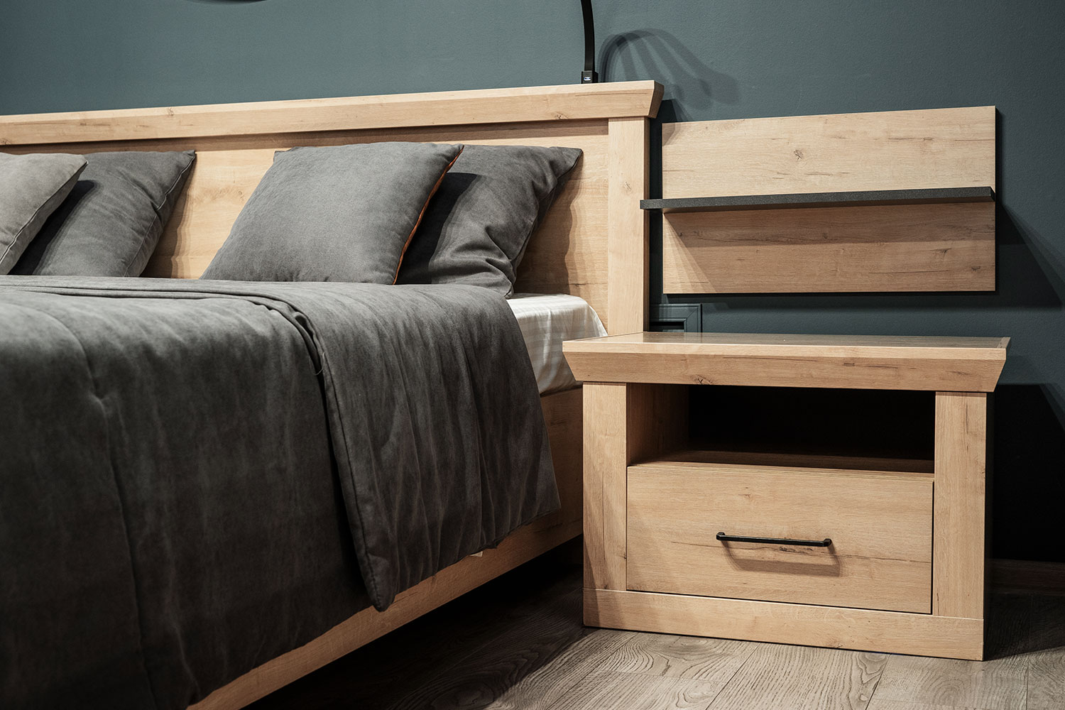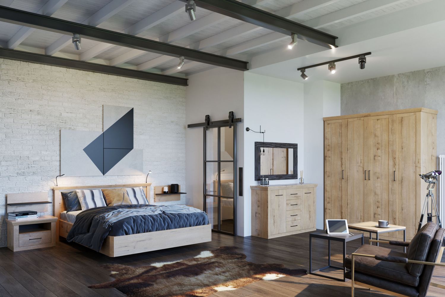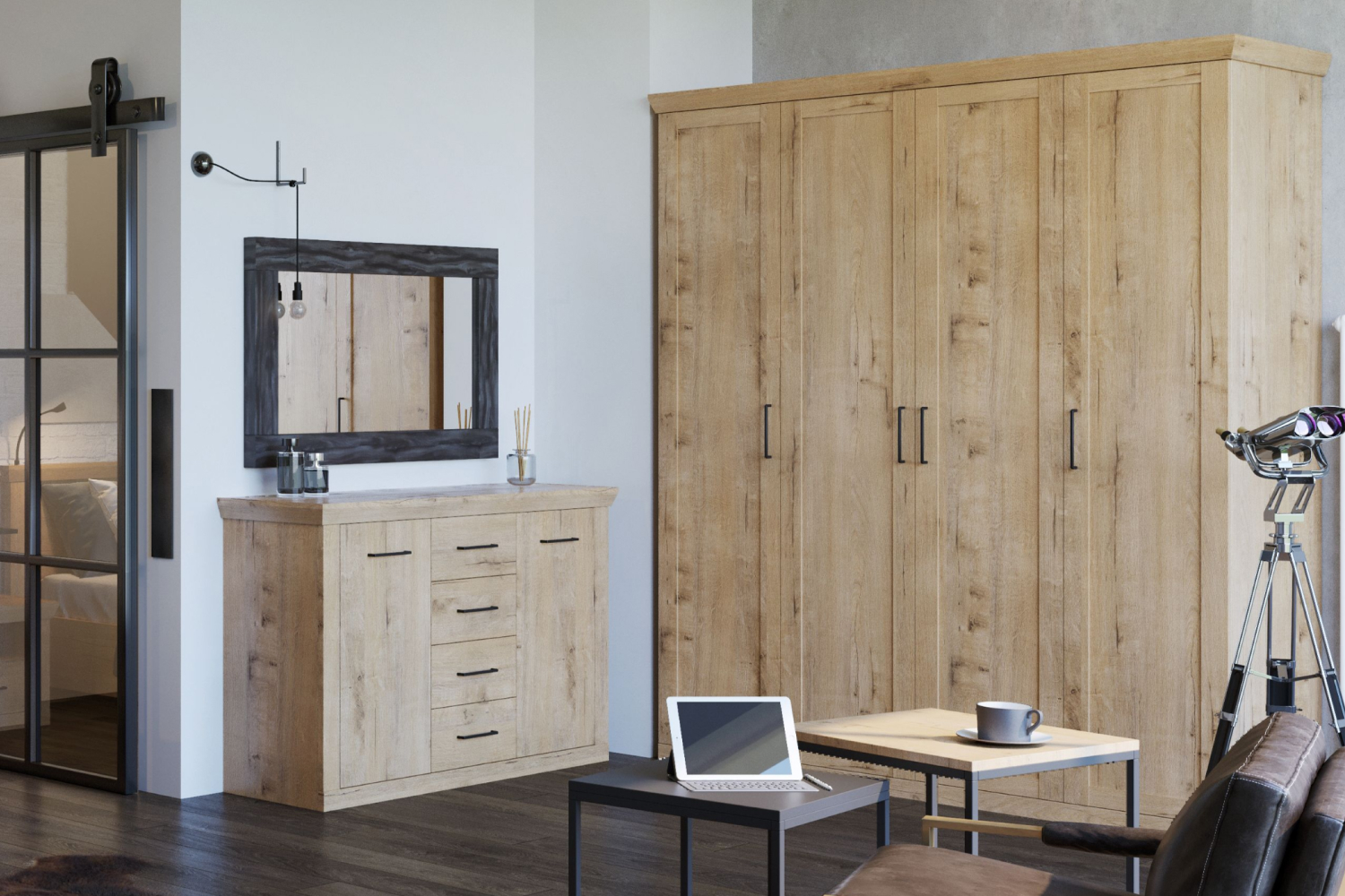 Сдержанное колористическое решение коллекции отлично сочетается с любой облицовкой стен и напольным покрытием. Спальня идеально подходит тем, кто ценит современные тенденции и обладает хорошим вкусом. Рамочные конструкции, древесные текстуры, минималистичная фурнитура универсальны и великолепно впишутся в интерьер лофт, фьюжн, эко, сканди. Все ручки окрашены в стильный черный оттенок «античное железо».