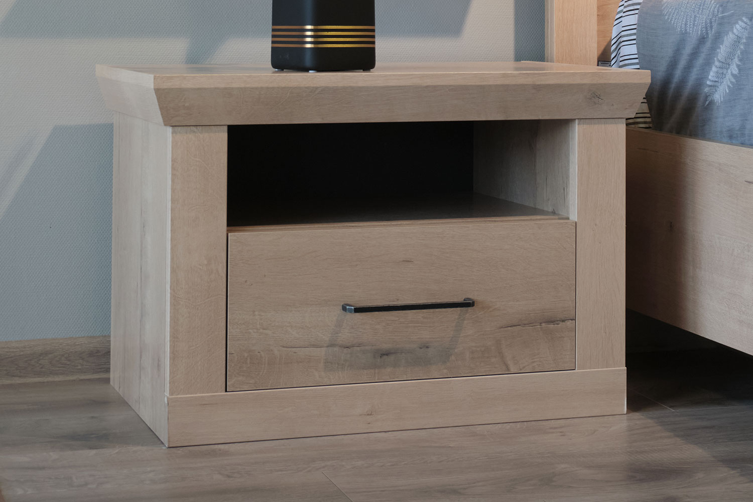 Комплект состоит из эргономичной кровати, вместительного шкафа, прикроватных тумбочек, удобного комода, который может выступать и в качестве туалетного столика. Поверхности всех предметов выполнены в одном стиле, изделия небольшой высоты имеют скошенную кромку. Качественная фурнитура обеспечивает максимальную функциональность всех систем хранения. Наполнение и габариты мебели зависят от выбранных модулей. Кровать с высоким изголовьем и ортопедическим основанием гарантирует крепкий и здоровый сон.