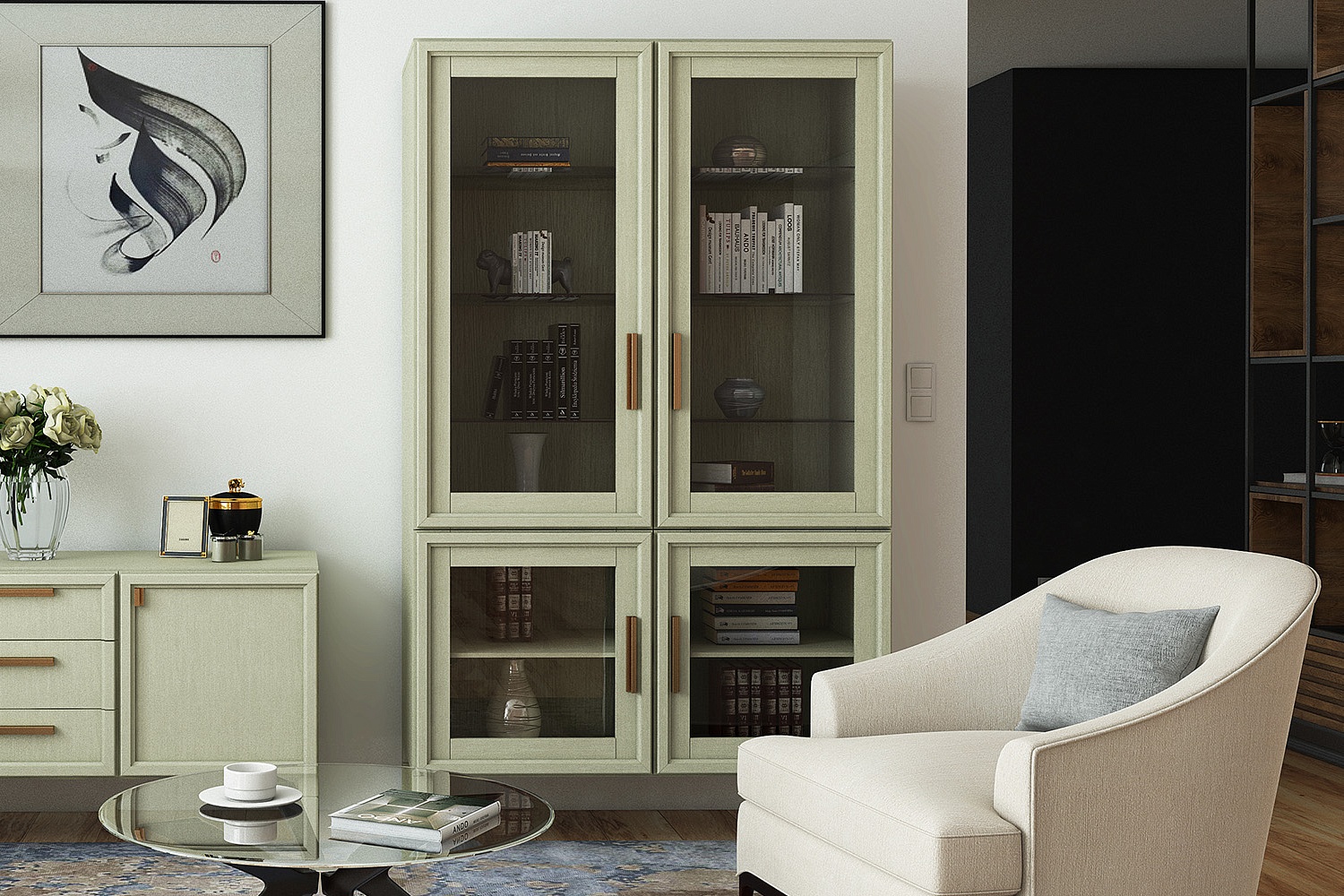 - Два отделения со шпонированными внутренними полками, за двумя распашными стеклянными дверцами в нижней части, и по умолчанию, два отделения с тремя стеклянными полками, за двумя распашными стеклянными дверцами в верхней части;